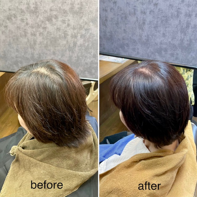 グレイファッションカラーのお客様。お選び頂いた明るめのグレイピンクブラウンは鮮やかなその色味と比較的強い白髪のカバー効果で、お洒落で個性的な雰囲気を醸し出しながら「白髪の主張」もしっかりと抑えられます。もう少し自然な色味をお望みならば、複数のカラー剤の混色でより希望に近づけることもできます。