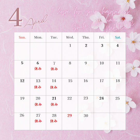 4/1(水)店長9:00~11:00○13:00~18:00○河村9:00~18:00○南口佳枝11:00~13:00○15:00~19:00○